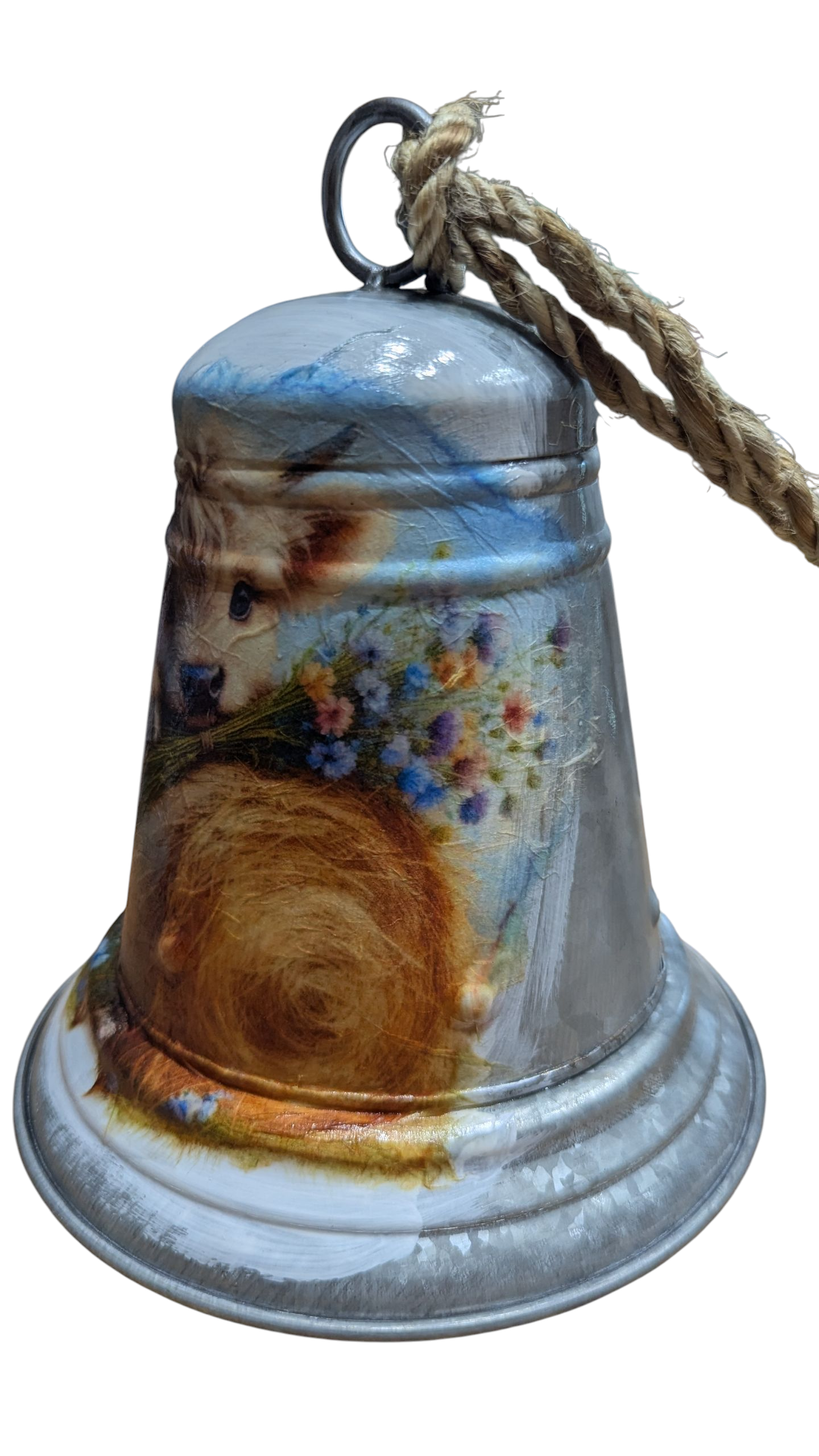 The bell stands 8" tall and is made with galvanized metal