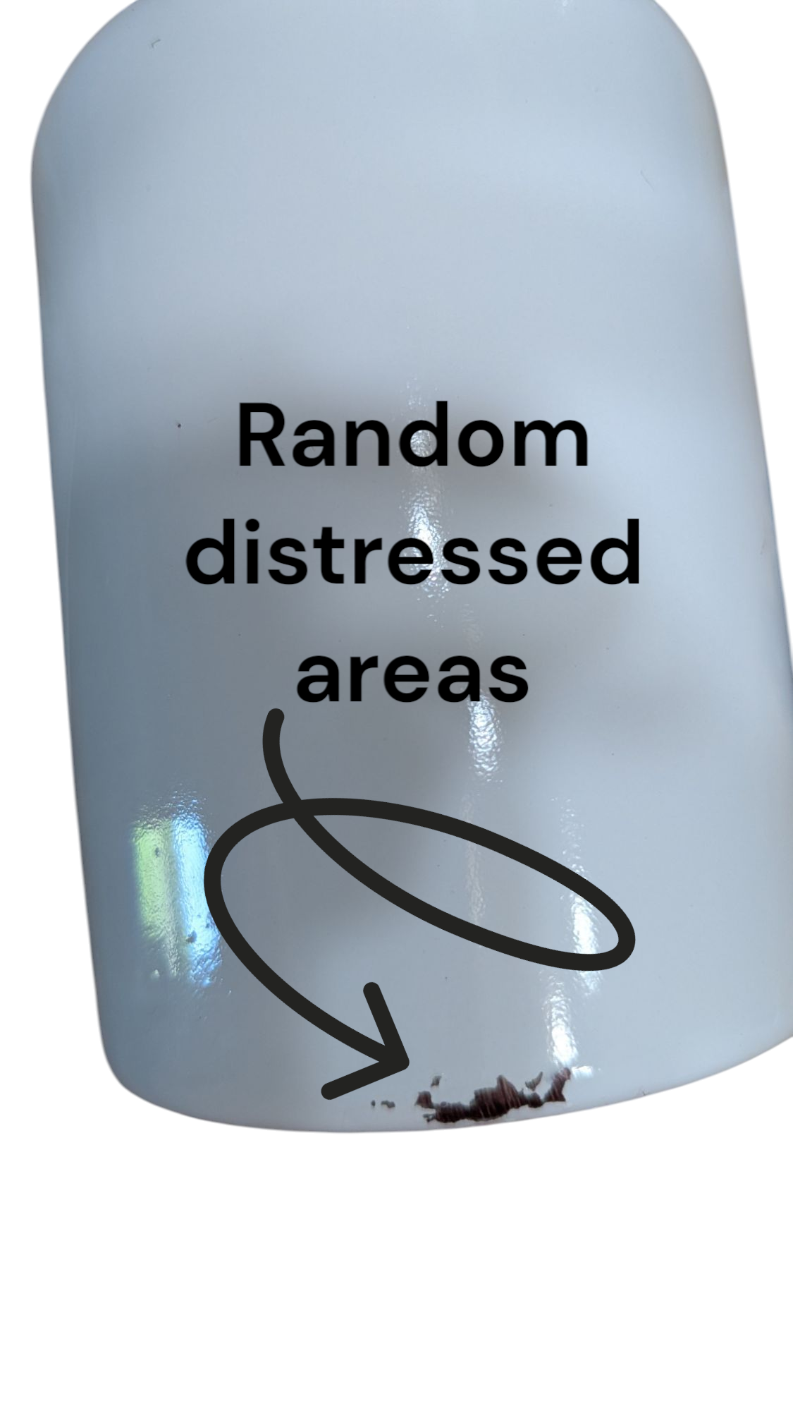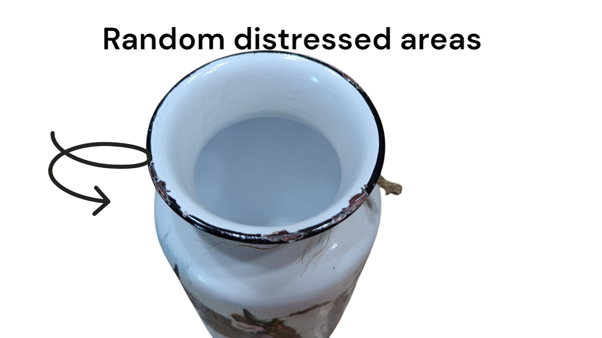 - The metal vase stands 8" tall with a distressed white enamel finish